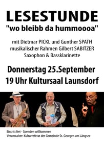 Der Besuch hielt sich in Grenzen (40), doch was geboten wurde regte zum Lachen, Nachdenken, Besinnen und Verwundern an! Nahezu 2 Stunden ein abwechslungsreiches Programm von den Autoren Spath bis Jandl und eine sehr passende Musik von Gilbert Sabitzer dazu. Gesehen wurde. 2. Vize BGM Karl Kohlweg, GV Manfred Sacherer, GR Hans Slamanig, Leo Hütter, Stefan Bertram und Ernstl Grojer, sowie die Künstler Waldemar Gstallnig und Erwin Beiweis.